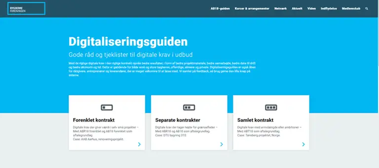 Guiden giver også et overblik over internationale standarder, teknisk fælleseje, lovgivning, undersøgelser og håndbøger om digitalisering. Digitaliseringsguiden dykker desuden ned i udbudsmateriale fra tre byggeprojekter og giver konkrete eksempler på, hvordan digitale krav kan formuleres. Guiden er derfor også relevant for bl.a. rådgivere, entreprenører og leverandører.